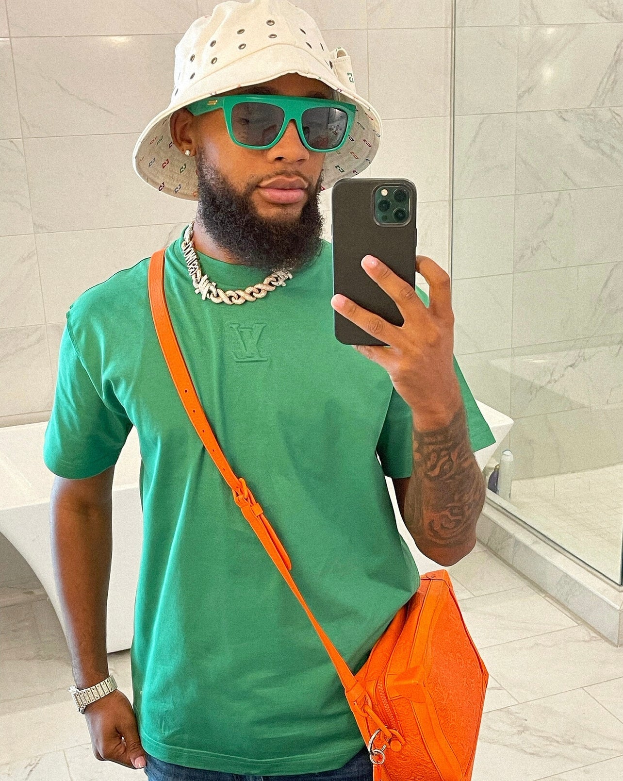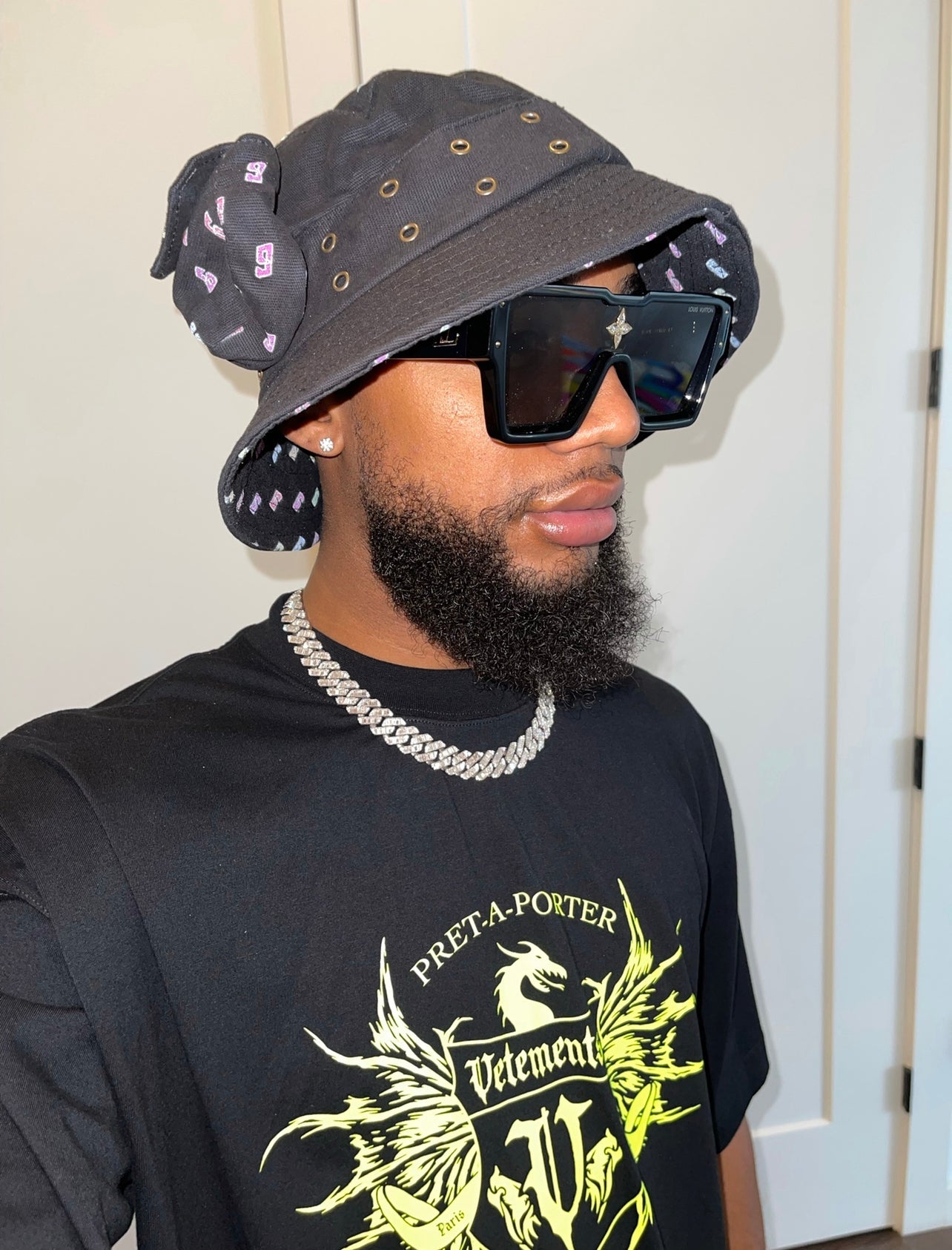 Monogram colorful G logo printed inside hat. Attached is a cargo pocket that can be removed with monogram colorful G logo print.