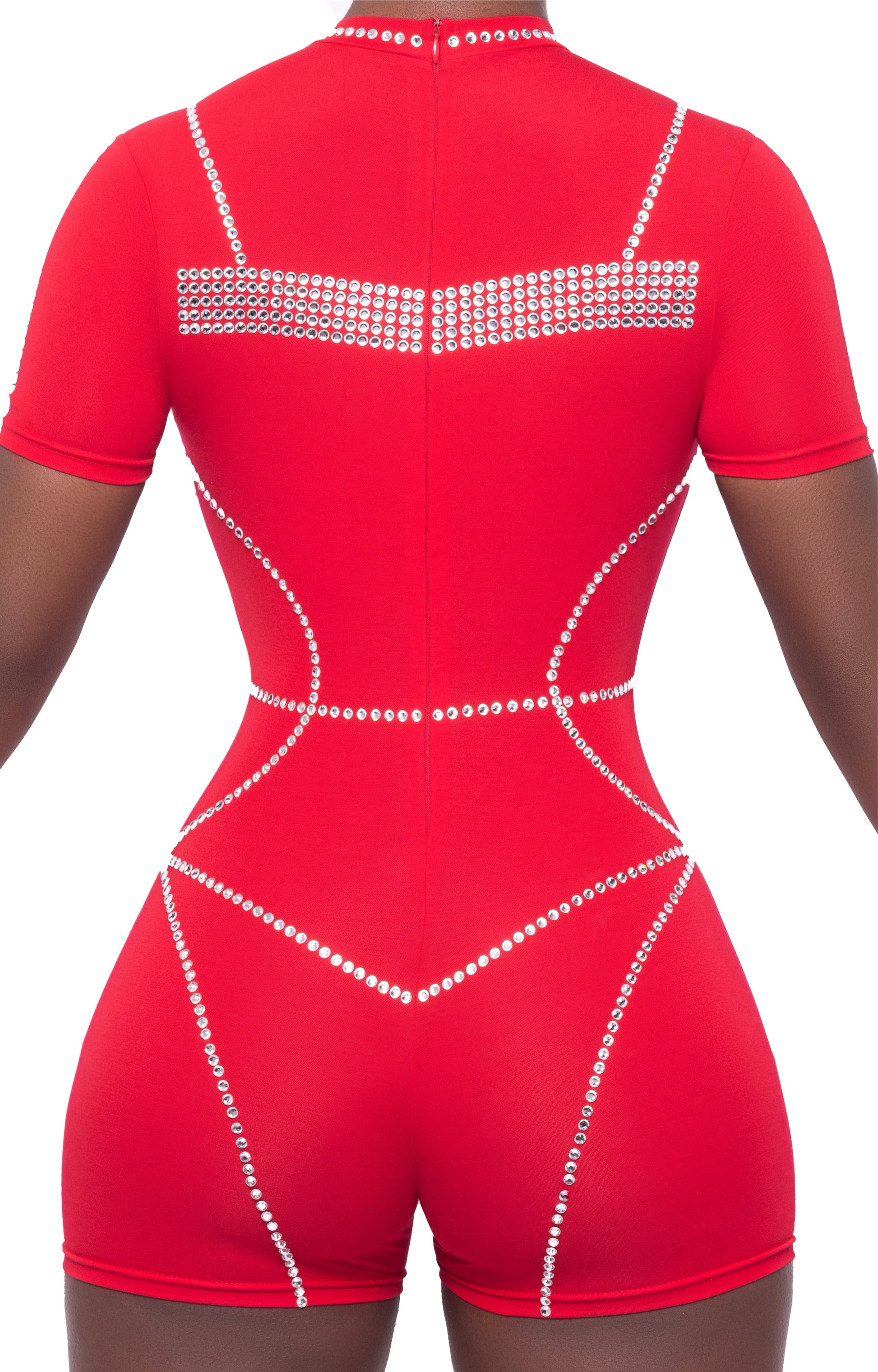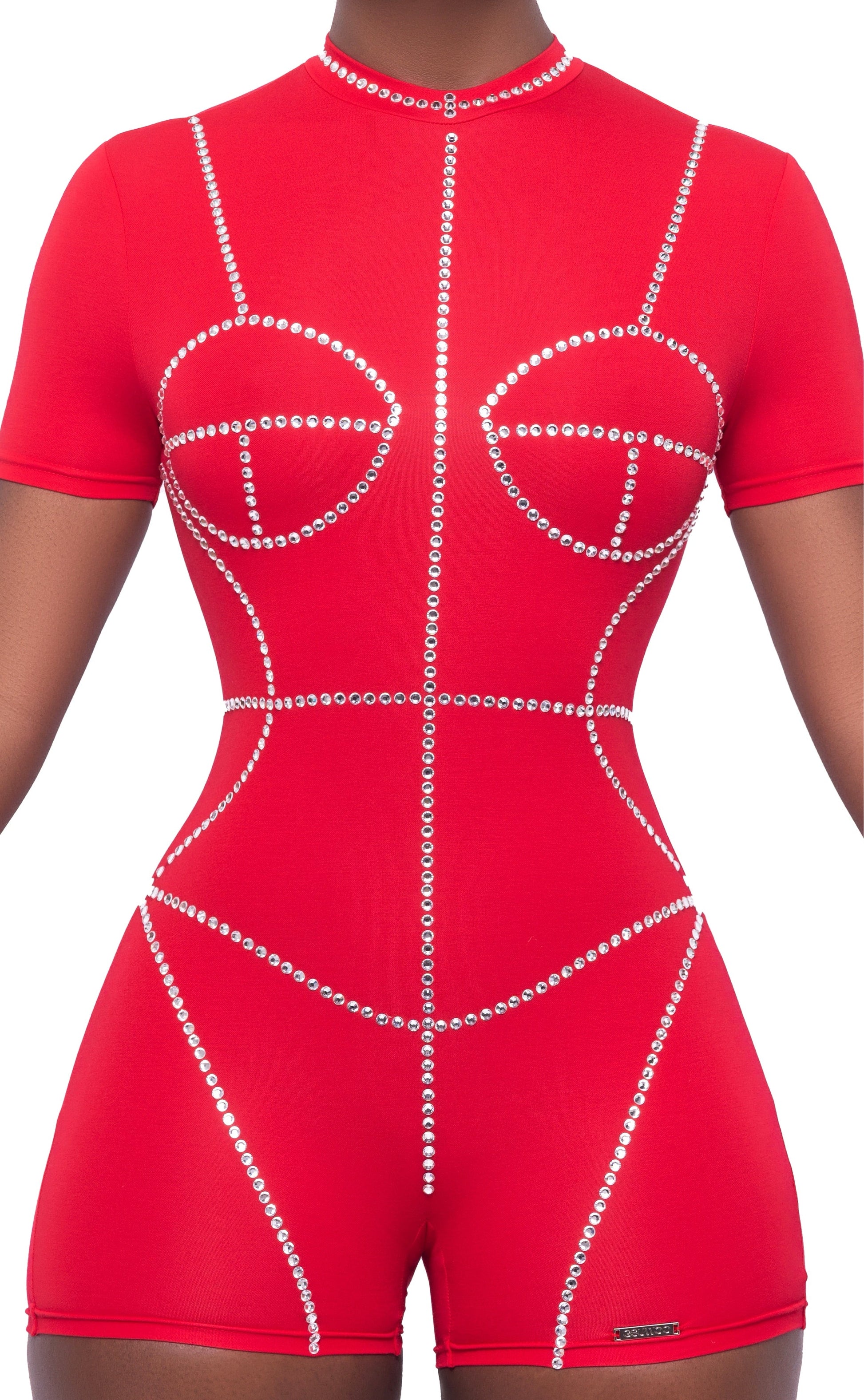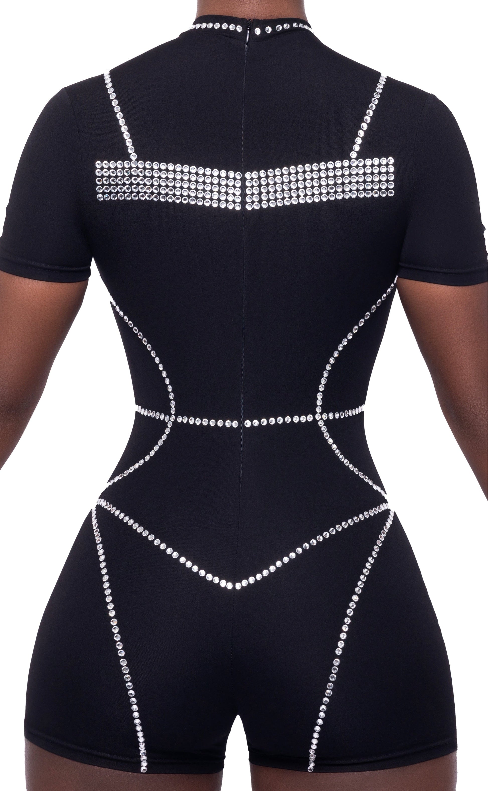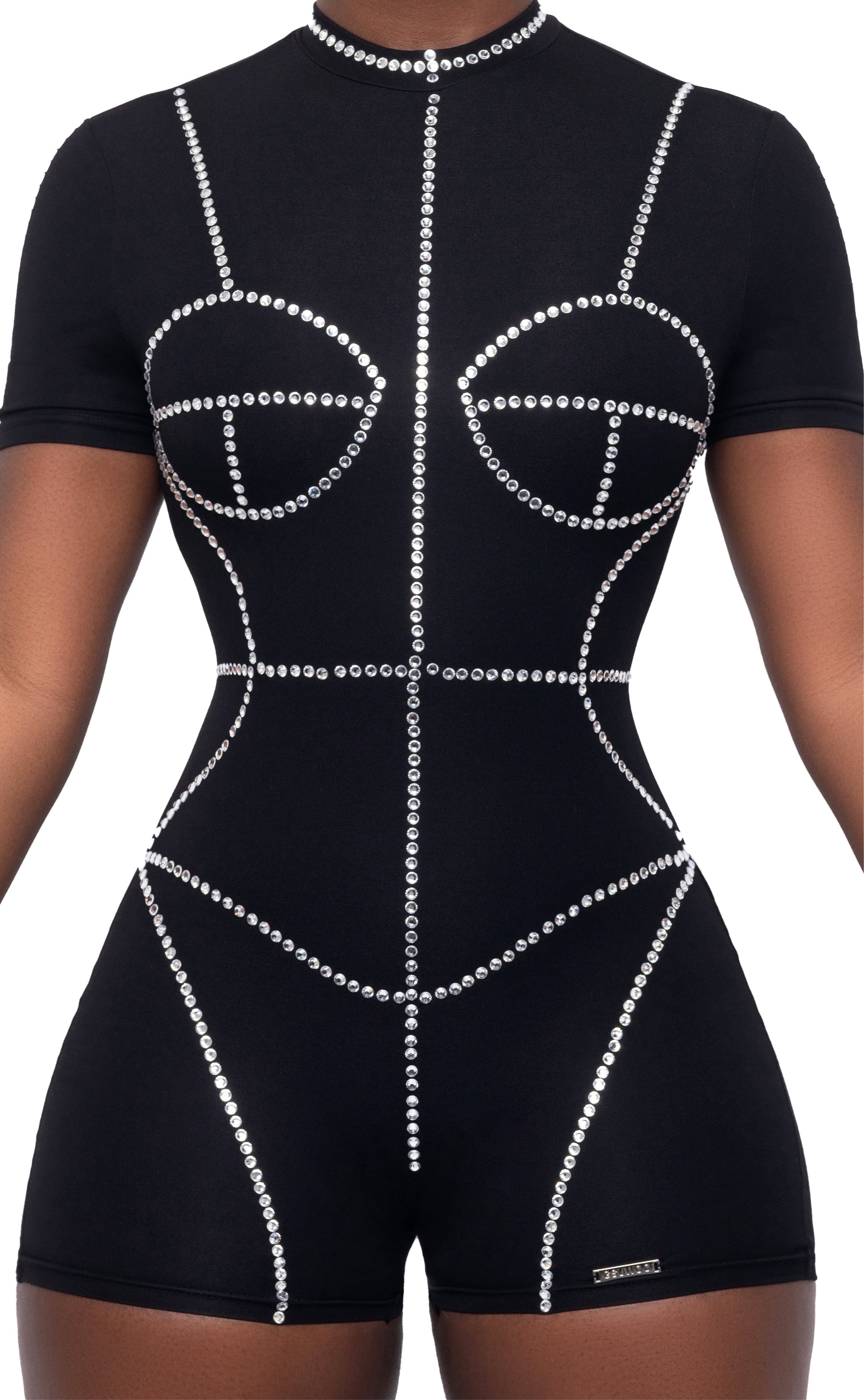 Sparkling with hand-stoned crystals, our Croquis Suit is a show-stopping bodysuit made with stretch compress fabric and metal hardware. Perfect for a night out or dinner, it captures attention with its symmetrical crystal design.